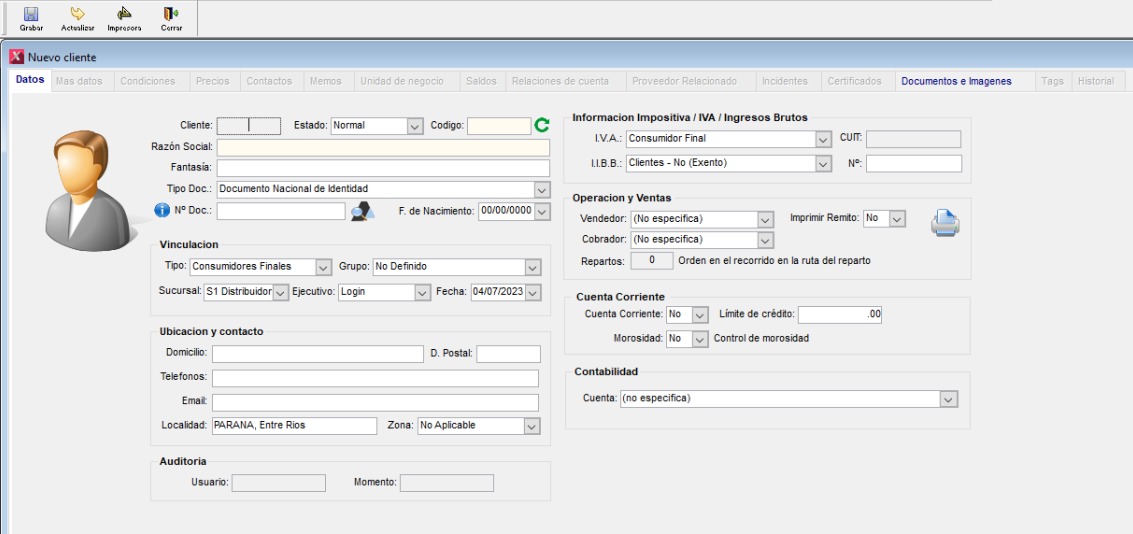 Una vez realizada la carga, el sistema asignara al cliente un ID único el cual se ve en el campo "Cliente" y se habilitaran las demás pestañas donde podemos agregar información complementaria del cliente, esta información es utilizada por los demás módulos del sistema para realizar acciones especificas.