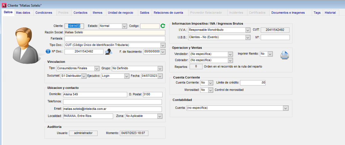 Se ingresa a la ventana de modificación del cliente mediante doble clic, desde aqui se tiene acceso a modificar cualquier dato del cliente.