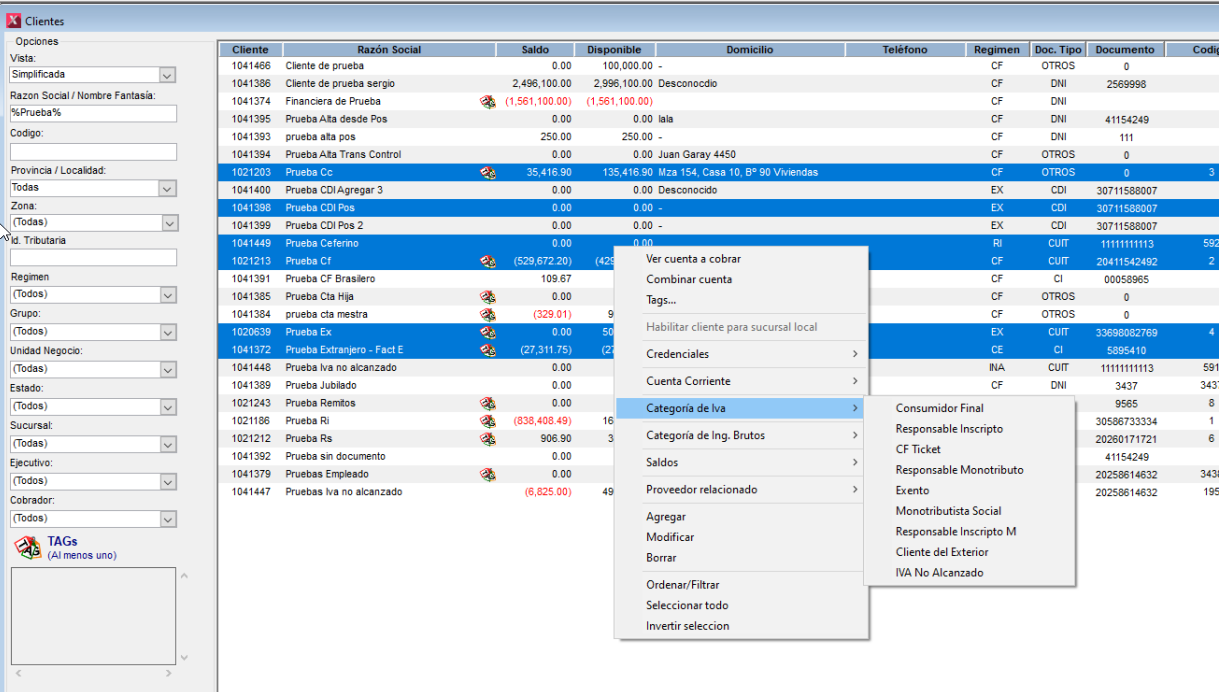 Es posible realizar este tipo de acciones mediante el menú contextual del buscador de clientes (El cual se accede con clic derecho), se puede seleccionar uno o varios clientes y realizar un cambio sobre la selección realizada.