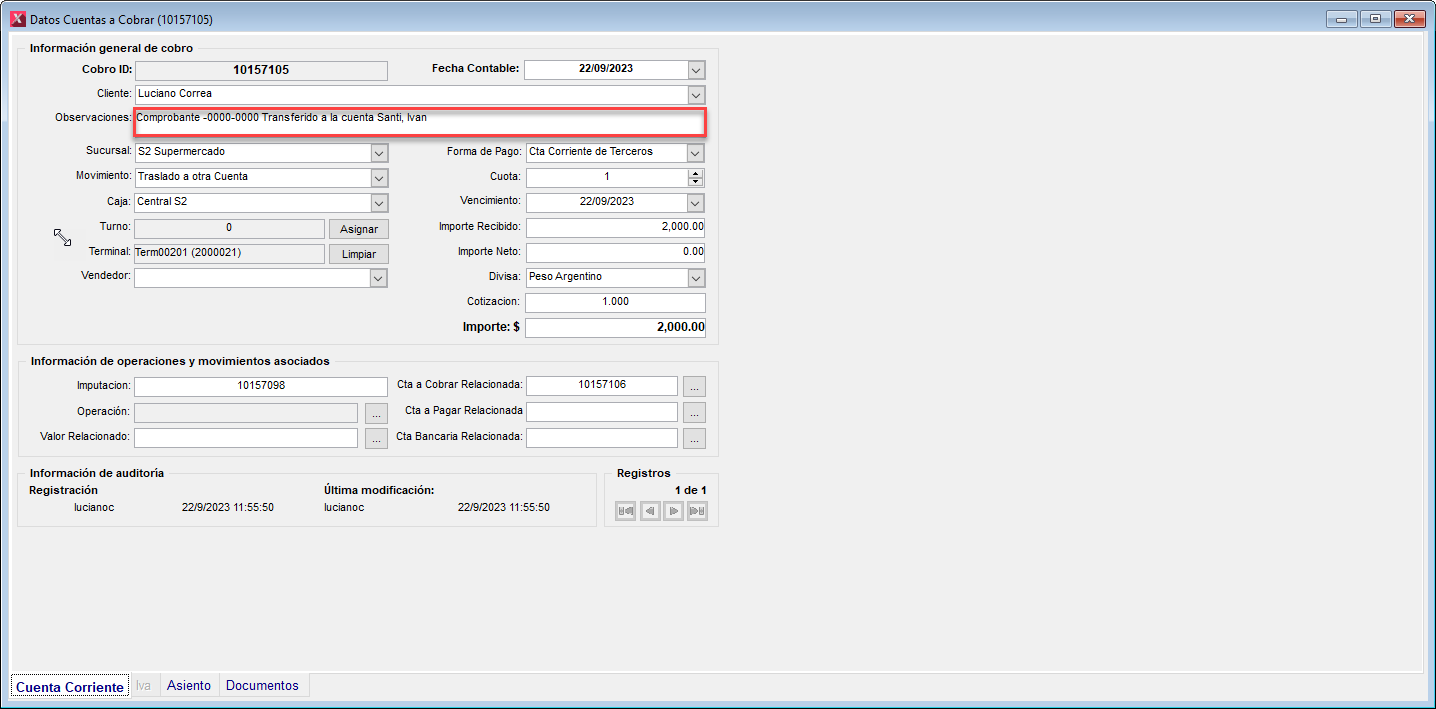 haciendo doble clic en el movimiento de traspaso te mostrara una vista mas detallada y a quien fue traspasada.