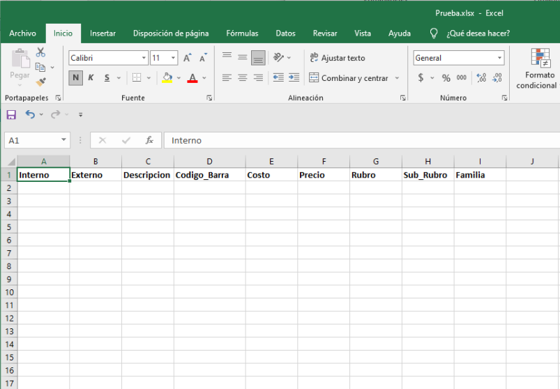 Mediante esta accion se creo el archivo prueba en la ruta seleccionada de nuestro disco, el Excel se ve de la siguiente forma: