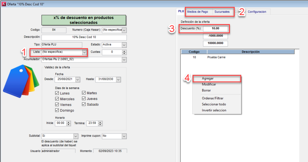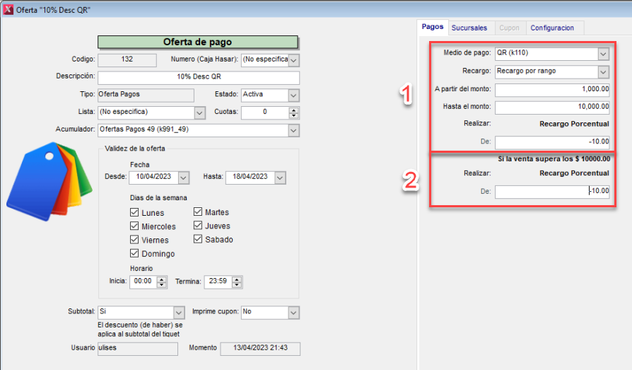 - 1. Permite seleccionar el medio de pago de la oferta y el porcentaje de descuento. Este descuento de aplicara desde el monto X hasta el monto X + Y.