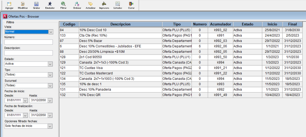 Su comportamiento se define una sola vez, se puede definir la cantidad de unidades a partir de las cuales se aplica la oferta, definir un descuento fijo o porcentual. Luego de definir como se comporta la oferta, se agregan los productos que van a formar parte de la misma. Esto se propone por medio de un browse en el cual se pueden agregar a la oferta múltiples productos de una sola vez. A nivel caja Hasar, la oferta se aplicará cada vez que se venda un producto que está contenido en esta oferta si es que la venta de este cumple con las condiciones definidas en la oferta.
