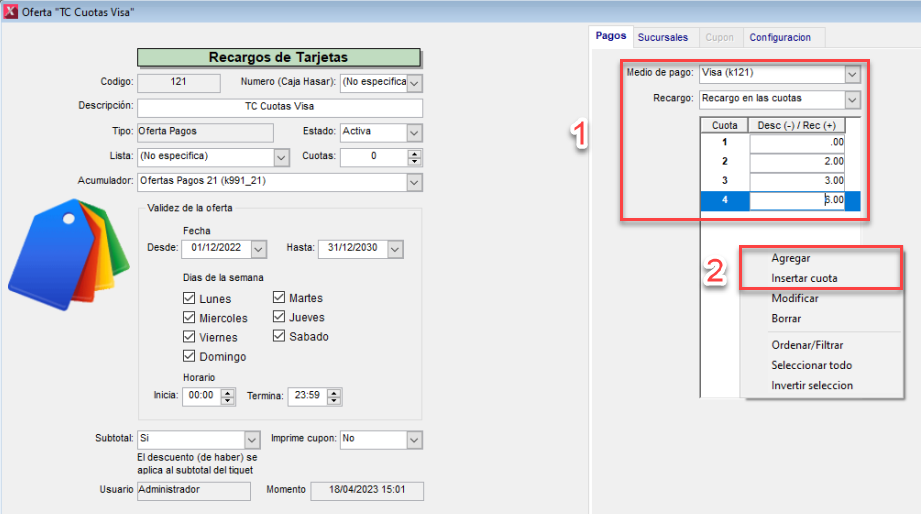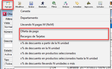 Este tipo de oferta permite definir el comportamiento de recargo que aplican las distintas tarjetas en la linea de caja.