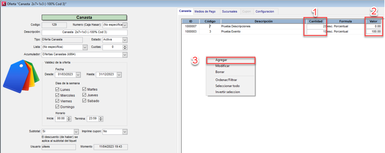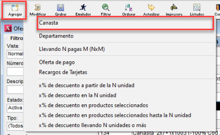 Importante: Las ofertas de tipo canasta se aplican solo cuando se compra la canasta tal cual está definida. Es decir que si una canasta incluye 3 productos y se compran 2 no se aplicará la oferta. Se deben comprar todos los productos que incluyen la oferta y la cantidad que se establece de los mismos o más. Si la cantidad vendida de uno de los productos que incluye la canasta es menor que la establecida para el producto, entonces la oferta canasta no se aplicará.