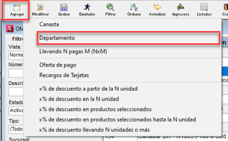 Se pueden definir ofertas de departamentos. Es decir ( Carnes, Pollos, Verduras, etc ). Notará que al seleccionar el tipo de oferta departamento se seleccionaran automáticamente todos los tipos de pago. Esto funciona así para el caso de estas ofertas, ya que los medios de pagos son generales a todas. Las mismas se comportan de acuerdo a lo que se define en éste diálogo.