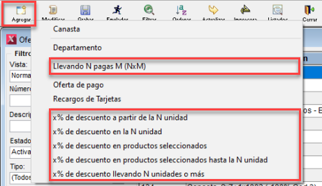 En este tipo de oferta lo que se hace es definir una oferta que se aplica a un conjunto de productos, para dar de alta una oferta de este tipo existe la siguiente lista de plantillas pre configuradas: