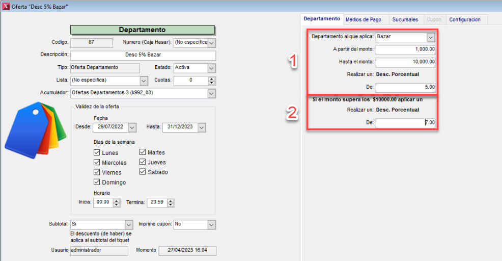 - 1. Permite seleccionar el departamento de la oferta y el porcentaje de descuento. Este descuento de aplicara desde el monto X hasta el monto X + Y.