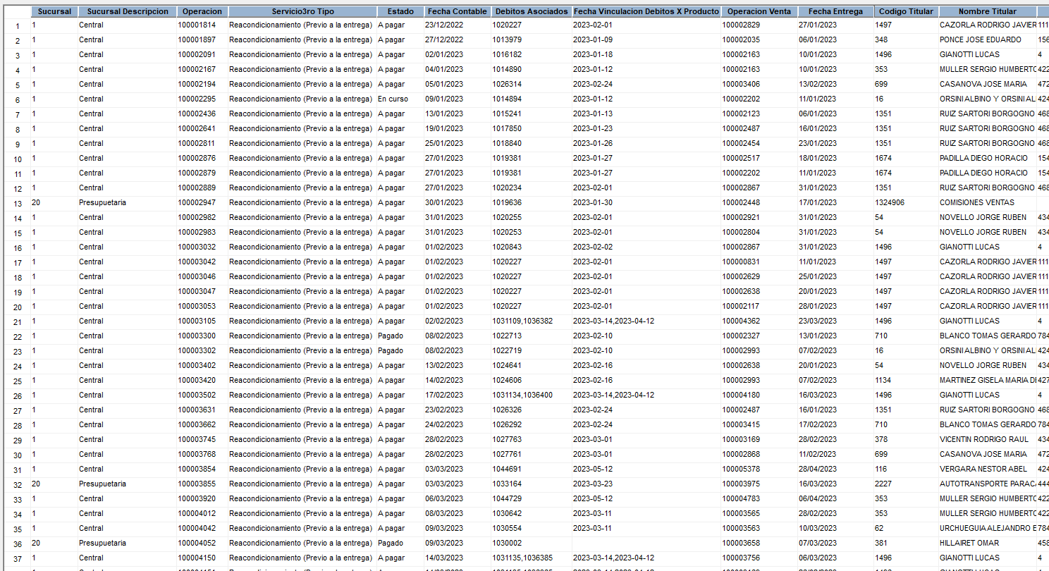 Esta exportación es utilizada para detectar estos casos ya que se trata de información faltante en el costeo del vehículo, los reacondicionamientos son anteriores a la entrega pero debido a demoras del proveedor la factura suele llegar despues de que la entrega del vehículo fue realizada. El encargado realizar los informes económicos debe detectar estos casos y tenerlos en cuenta para el próximo económico ya que de lo contrario quedaran afuera del informe.