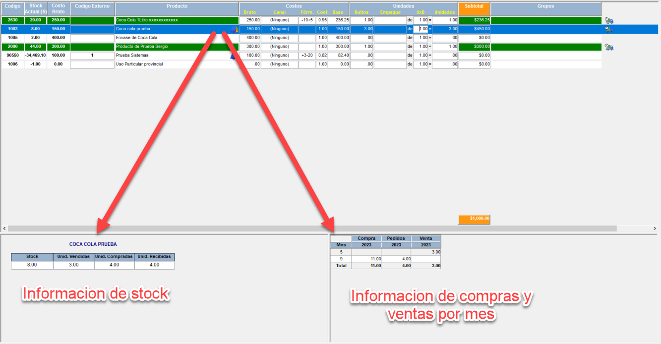 Al seleccionar un producto de la lista el sistema muestra la siguiente información: