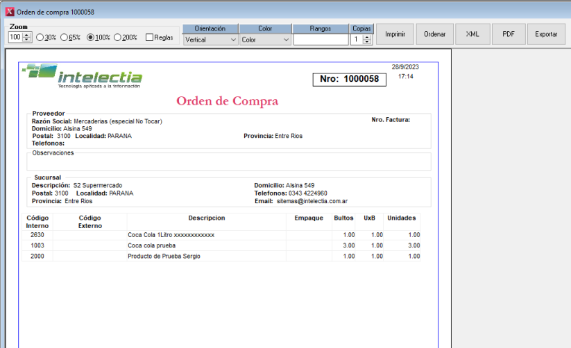 Podemos imprimir un reporte de orden de compra haciendo click en el botón