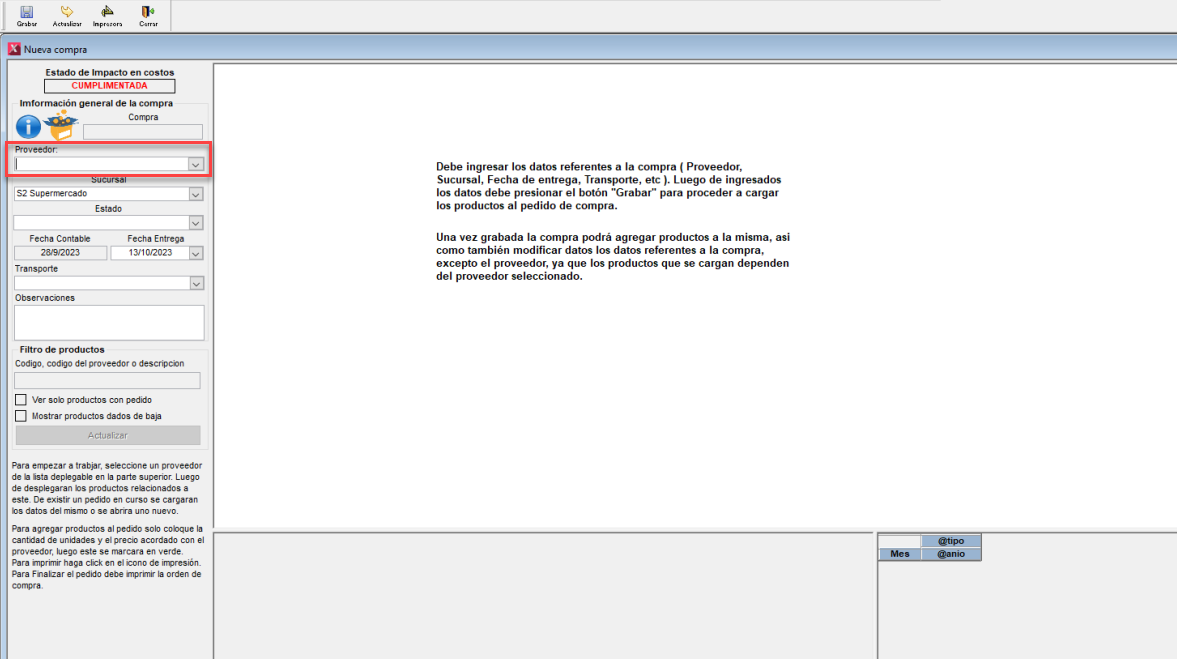 Una vez en la ventana debemos seleccionar el proveedor al cual le realizaremos la compra: