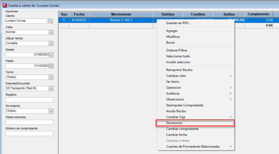 Una vez Allí podemos hacer clic derecho sobre el registro que deseamos devolver y seleccionamos "Devolución"