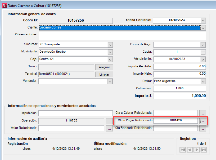 Si entramos al detalle del movimiento "Devolucion" podemos ver lo siguiente: