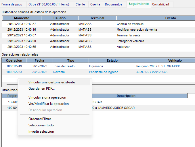 - Desde la venta vamos a la pestaña de "Seguimiento" y realizamos clic derecho en la zona que se ve en la imagen seleccionando "Vincular una gestoría existente"