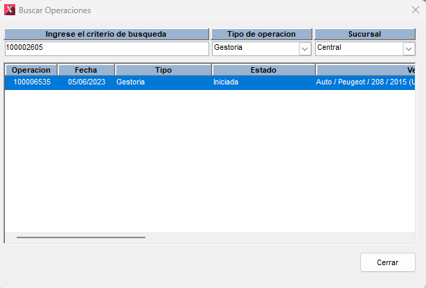 - Se abrirá ventana de búsqueda con las operaciones del tipo gestoría para el vehículo de la venta, seleccionamos la indicada.